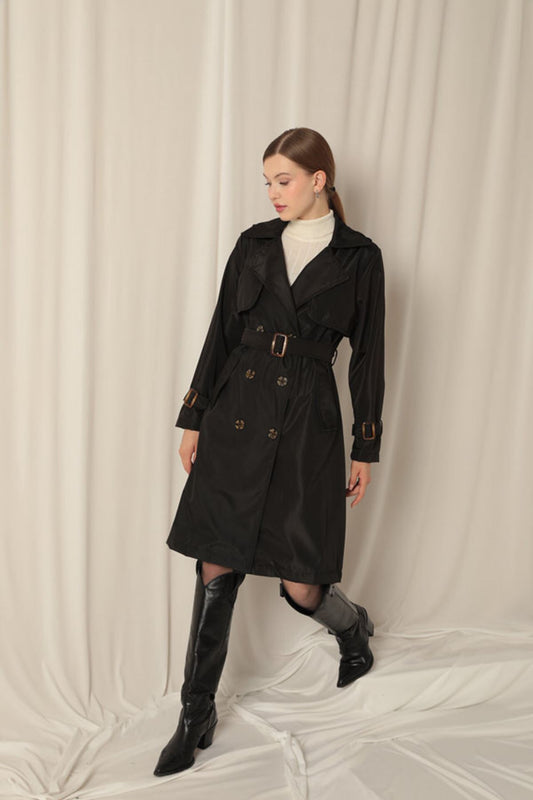Su Geçirmez Kumaş Lamineli Kadın Siyah Trençkot