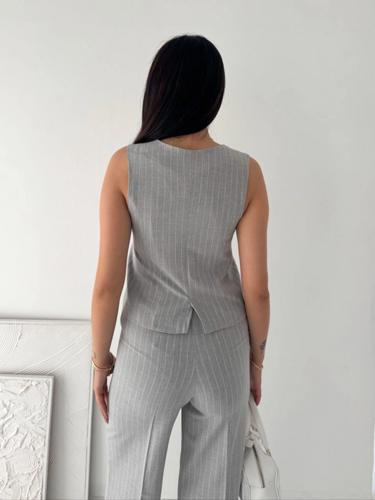 Kadın Çizgili Tansel Kumaş Yelek Pantolon İkili Takım Ofis Şık Modern - Gri
