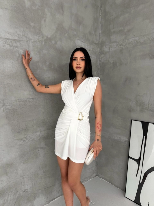 Kadın Kruvaze Drapeli Tokalı Mini Elbise Şık Gece Davet Abiye - Beyaz