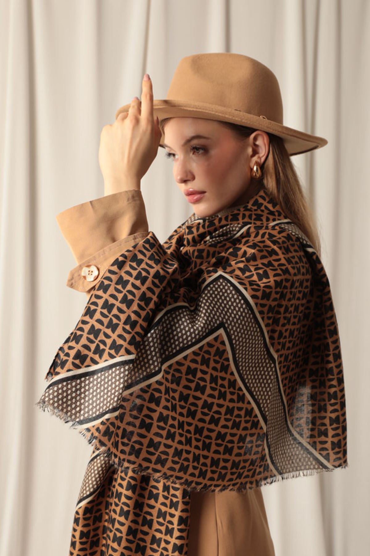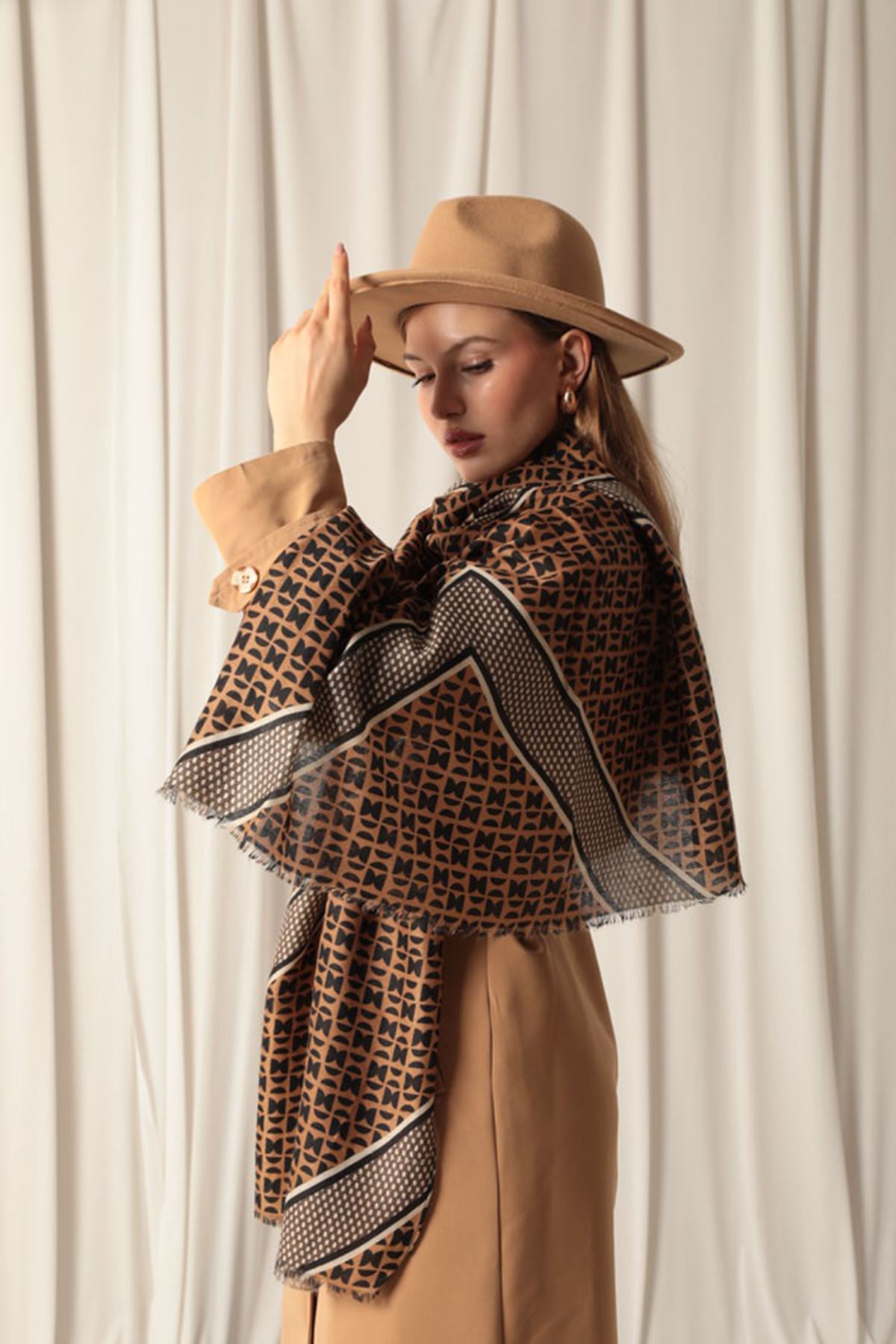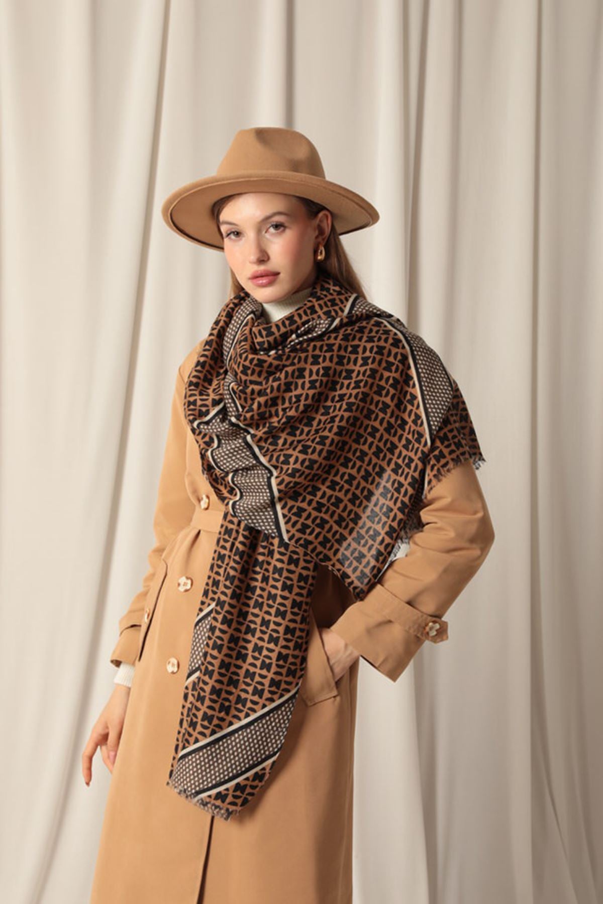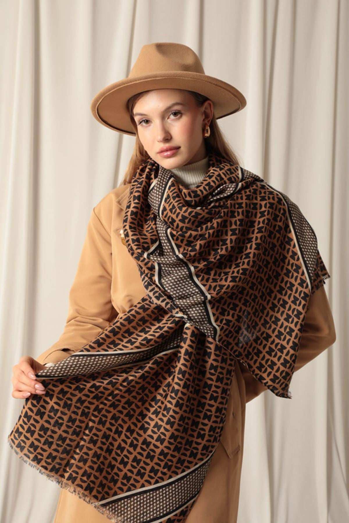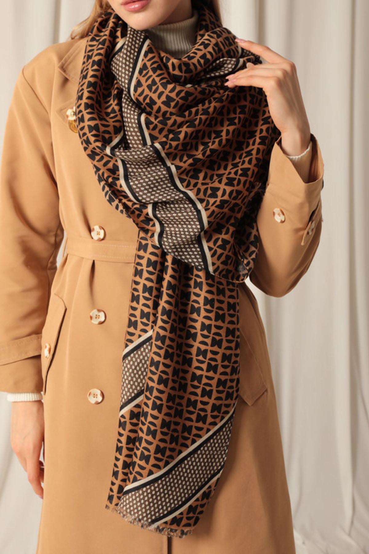 Etnik Desenli Kadın Kahve Şal
