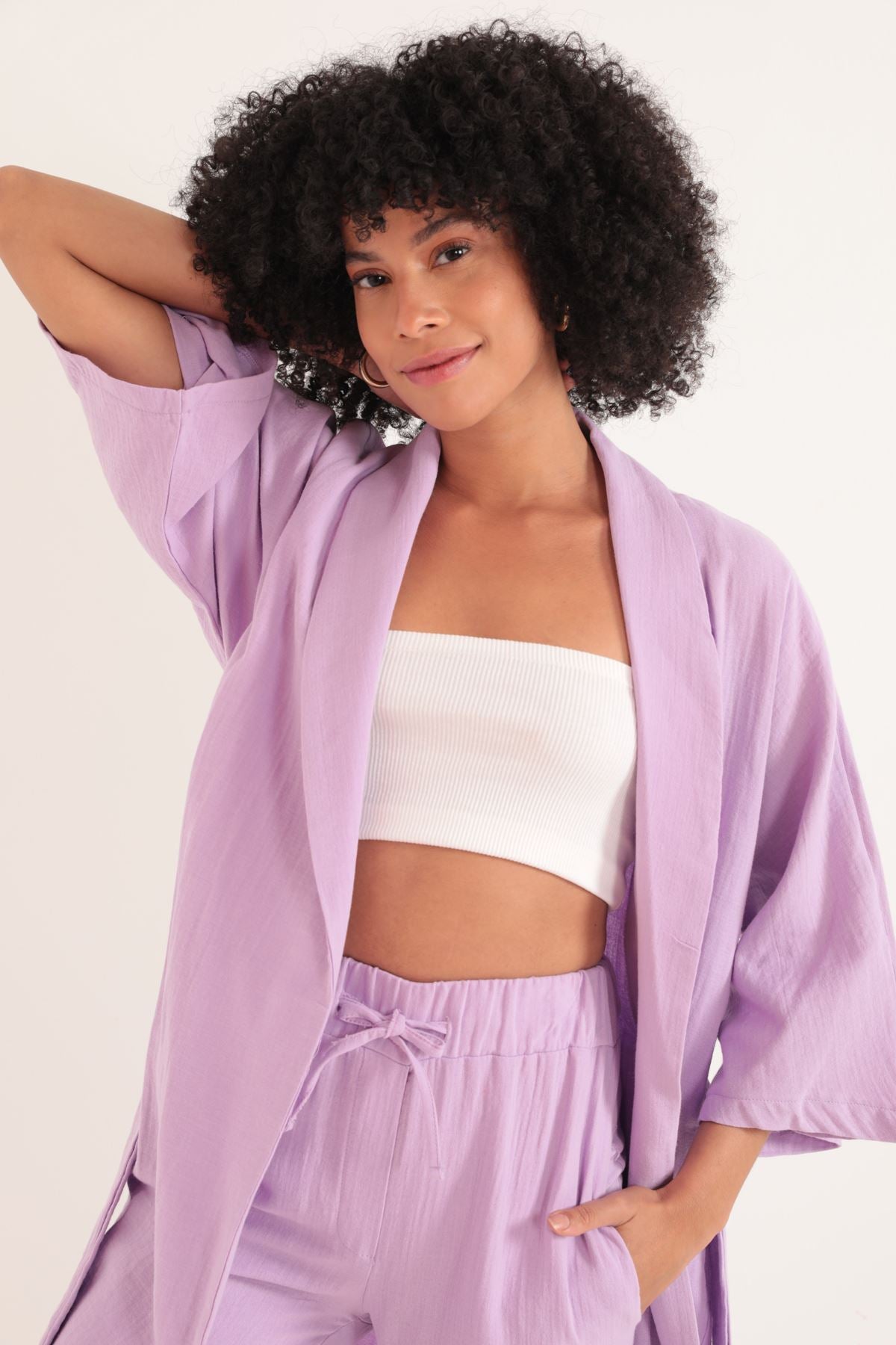 Müslin Kumaş Oversize Kadın Kimono-Lila