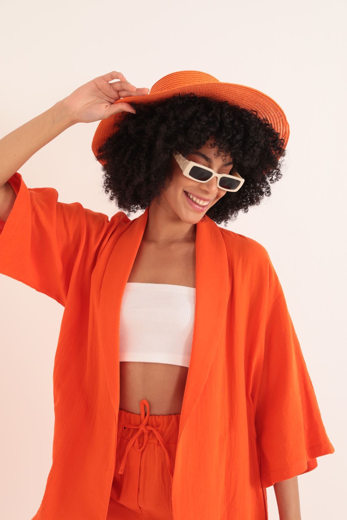 Müslin Kumaş Oversize Kadın Kimono-Oranj
